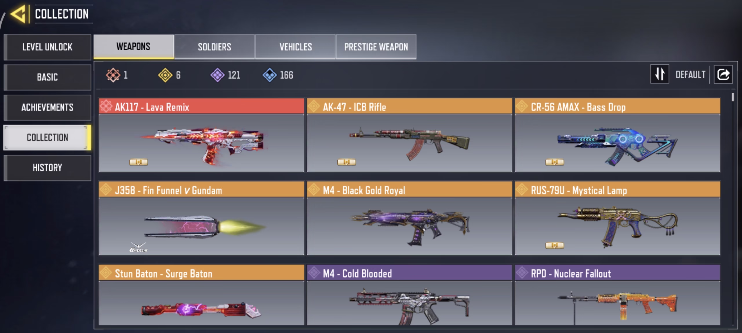 تمامی گان ها گلد و رنگ داماس واز شده ، ۱۴ تا دنس ، اسکین manta ray , ال ام جی لجند کلا ۵۰ تا کارت دیگه میخواد و هیچ cp خرج اکانت نشده